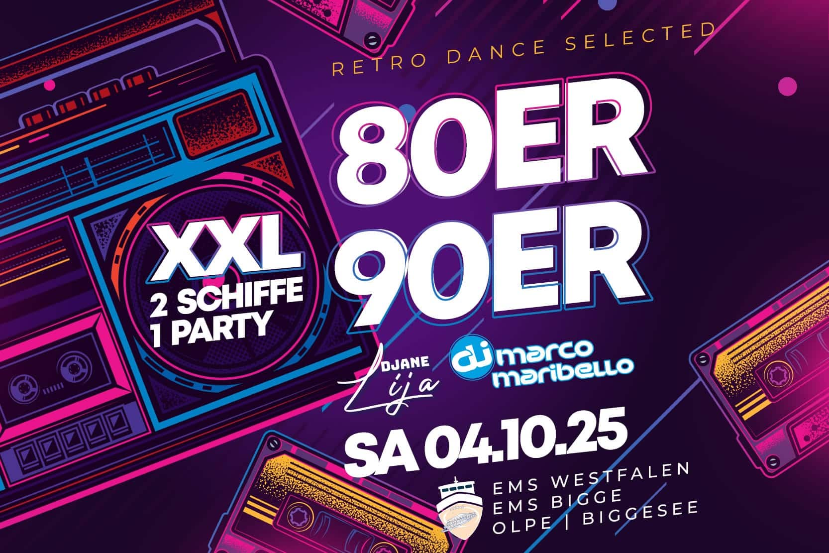 Bei der brandneuen 80er/90er XXL Party liefern sich DJane LiJa und DJ MarcoMaribello ein mitreißendes musikalisches Duell – vollgepackt mit den größten Hits, kultigsten Sounds und jeder Menge Nostalgie. Freut euch auf eine unvergessliche Nacht voller Retro-Beats, Neon-Vibes und ausgelassener Stimmung!